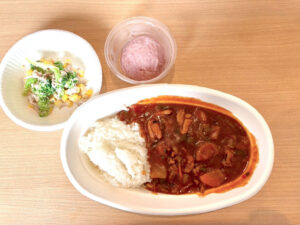 お待ちかねのお昼ごはん!今回のメニューは「ハヤシライス(黄)」「イチゴのジェラート風デザート(赤)」「サラダ(緑)」の3色が揃った、バランスのとれた内容になりました。なかでも一番人気は「イチゴのジェラート風デザート」。