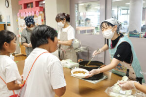 午前中は管理栄養士による夏野菜のお話とクイズに挑戦し、お昼ご飯はカレーライスとスイカを食べました。