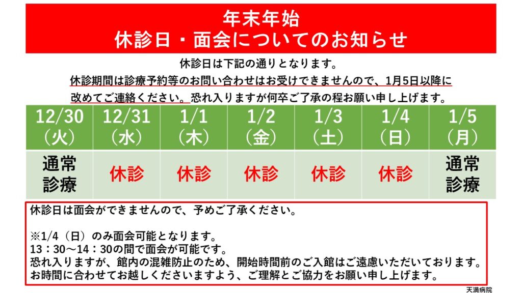 年末年始 休診日・面会についてのお知らせ