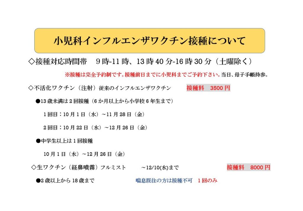 小児科インフルエンザワクチン接種について(R7.10.15更新)